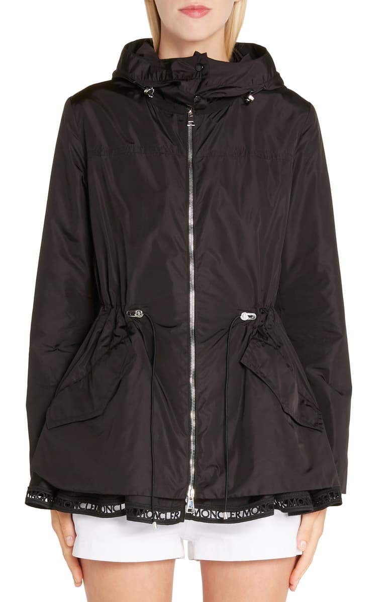 A cinched drawcord waist accentuates the figure in this rain-repellent jacket finished with cutout logo trim along the hem.