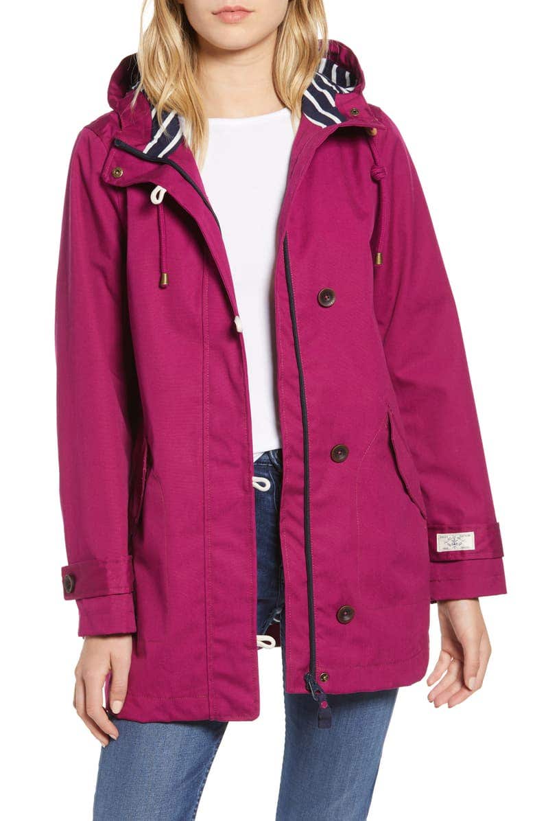 Nautical details refine a waterproof hooded jacket that's upgraded with a cozy jersey lining.