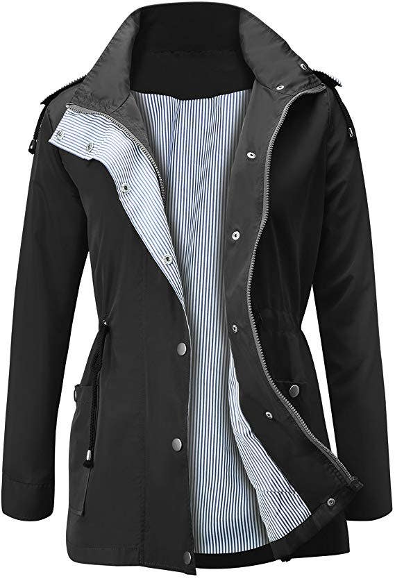 This rain coat has a detachable hood, drawstring waist design, and is breathable with a lightweight casual fit.
