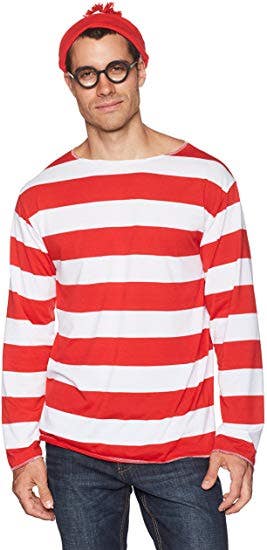 The Waldo costume features a red and white striped long sleeve shirt, striped beanie and round eye glasses.