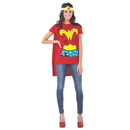 This Wonder Woman costume fits the bill! It comes with a red t-Shirt with golden Wonder Woman printed on it, bodice with attached red cape, and gold headpiece with red star in the center.