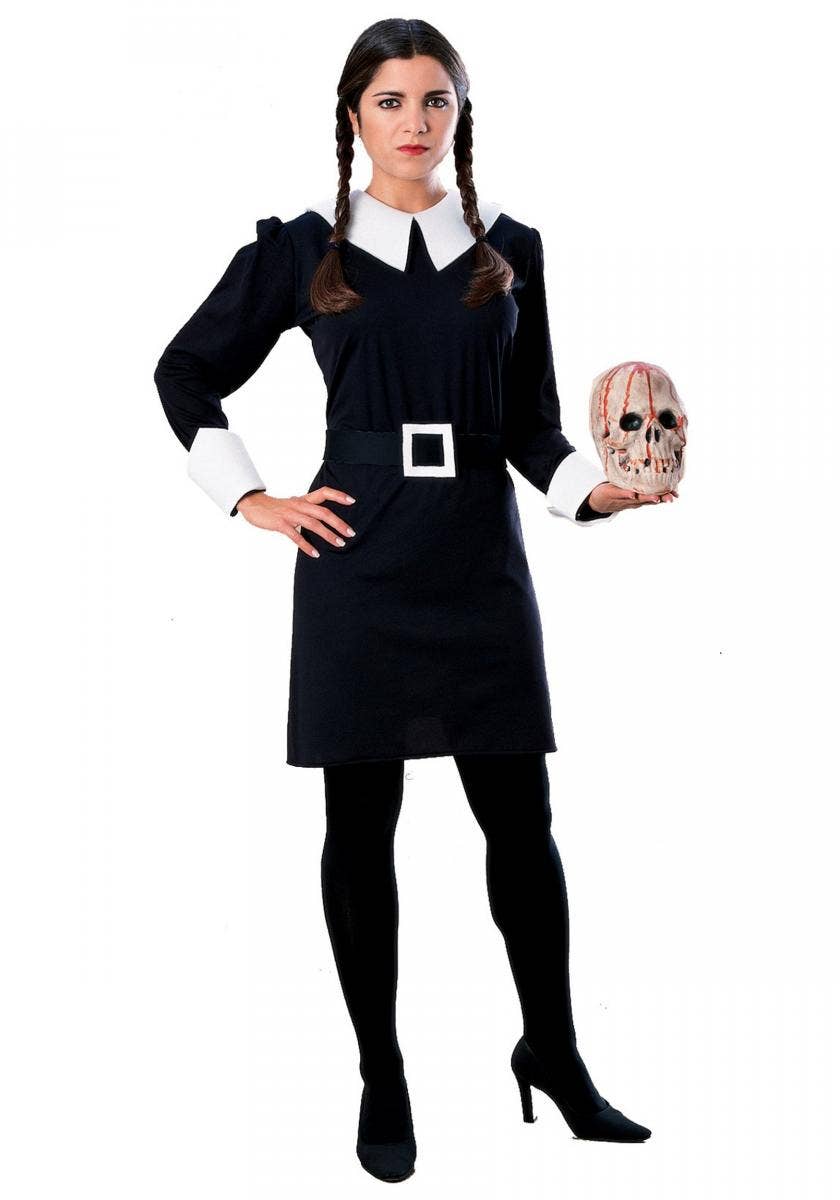 The jet-blackpolyester dress features white cuffs and collar, with a matching black belt with white foam buckle. It’s a perfect tribute to a creepy, kooky, eternally stylish fashion sense that’s stood the test of time and then some.