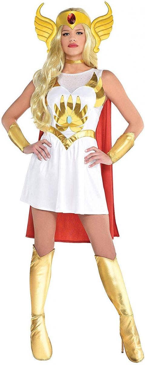 Make an entrance as a mythical warrior princess in this She-Ra costume. It includes a white and gold dress with a flowing red cape that will have you ready to fight the forces of evil. Finish the look off with gold choker, gauntlets, boot cover, and headpiece that matches the gold detailing on the dress.