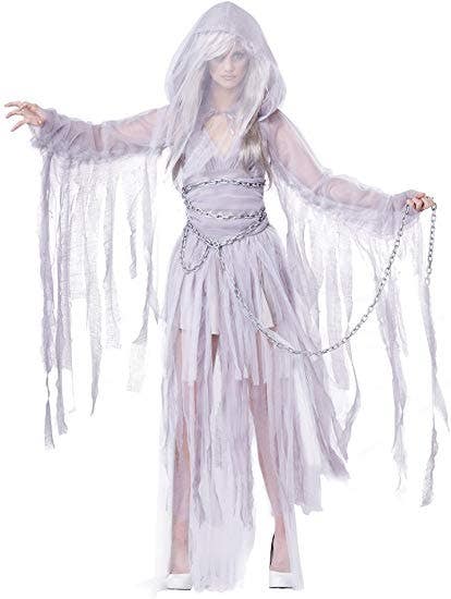 Cape with attached hood and chains shows this is one not-so-holy spirit with a story to tell.