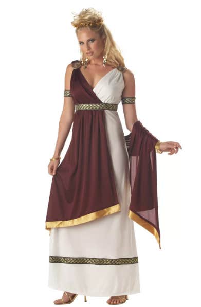 Be Helen of Troy or a woman of her generation with a costume that includes dress with attached drape, medallions and armbands.