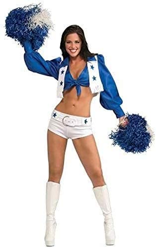 Cheer on the team in this officially licensed Dallas Cowboys cheerleader costume. Metallic blue, long sleeve, halter top with attached white and blue fringed vest.