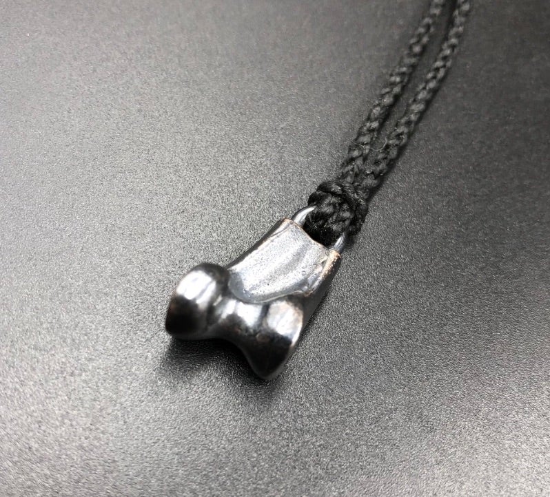 Based on the humerus bones of a seagull skeleton that the artist found on Monhegan Island in Maine, this pendant is made with shibuichi, an alloy of silver and copper. The cord is hand braided in house using a kumihimo loom. The yarn from which the cords are braided is polyester, dyed, spun, and waxed in Maine.