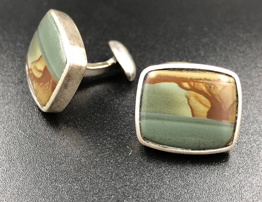 Sterling Silver and Owyhee Picture Jasper cufflinks with a fixed back and fronts measure 5/8 x 1/2 inch. These cufflinks are made in Denver, CO.
