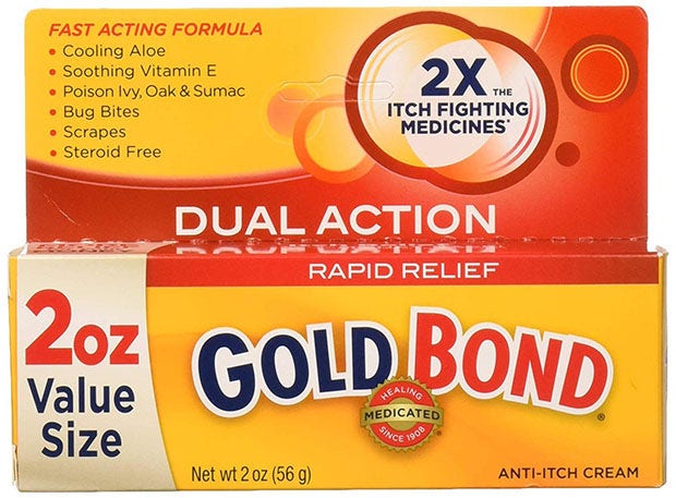 Gold Bond Medicated Anti-Itch Cream relieves pain and itch fast. Ideal for minor skin irritations, cuts, and burns, it also relieves itchiness caused by dry skin, poison ivy, oak, and sumac, insect bites, scrapes, and sunburn.