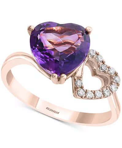Made of amethyst, diamond, and set in 14k rose gold, this double heart rose gold ring is both elegant and gorgeous. This EFFY ring is sure to radiate romance, no matter what outfit she wears it with.