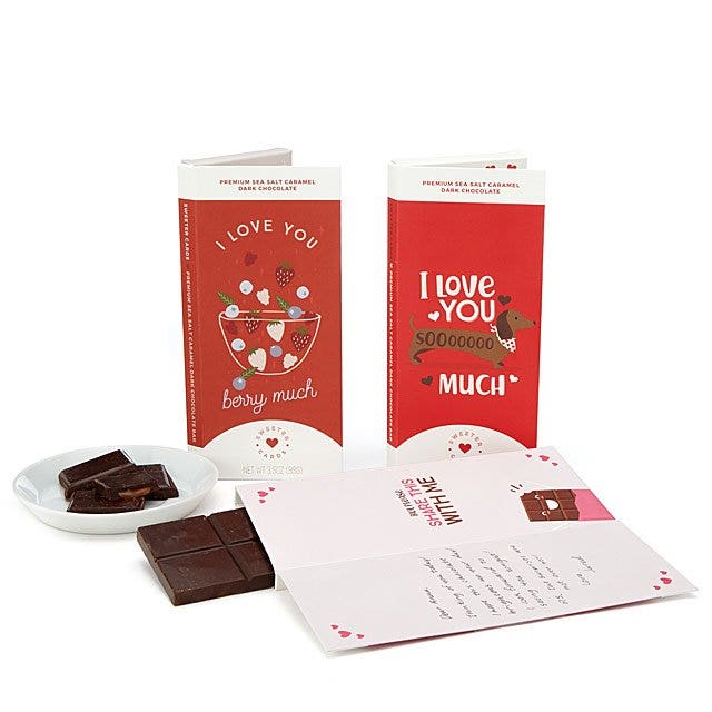 Each of these fun folding designs conceals a delectable dark chocolate bar filled with rich, creamy sea salt caramel (and made using fair trade ingredients). There's space inside for you to draft your own note, too, which means even more for your sweetheart to savor.