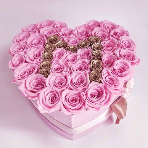 This light pink suede love box has pink roses that shape a gold letter M. What a gorgeous and unique arrangement for mom!
