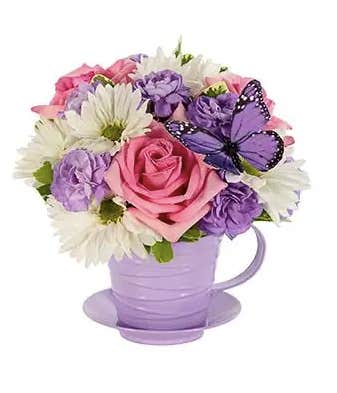 This bouquet includes pink roses, florigene mini carnations and white daisy poms, along with a butterfly. It comes in a container in the shape of a teacup with saucers.