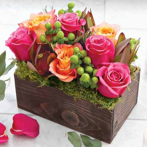 This beautiful arrangement of fuchsia and peach flowers comes in a wooden box. Offer mom the additional calming shades of emerald so she can display it anywhere in her home.