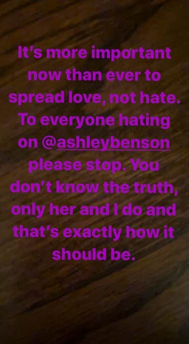 “It’s more important now than ever to spread love, not hate,” she wrote. “To everyone hating on @ashleybenson please stop. You don’t know the truth, only her and I do and that’s exactly how it should be.”