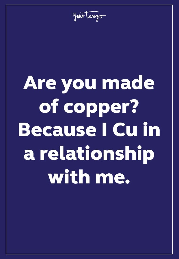 5. Are you made of copper? Cause I Cu in a relationship with me.