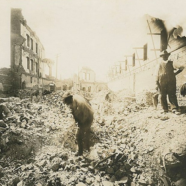 That night a mob of angry white men invaded Greenwood and began burning down the 35 blocks of Black Wall Street.