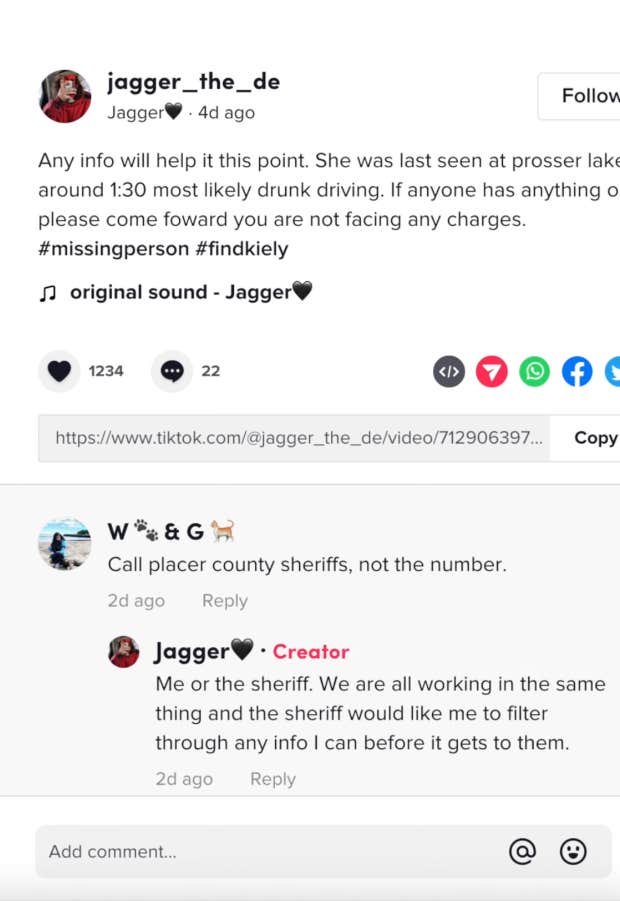 “If anyone has seen Kiely Rodni or her 2013 silver crv in the reno-Tahoe area call me [phone number] she has been a missing person for over 24 hours,” read the caption in his video.