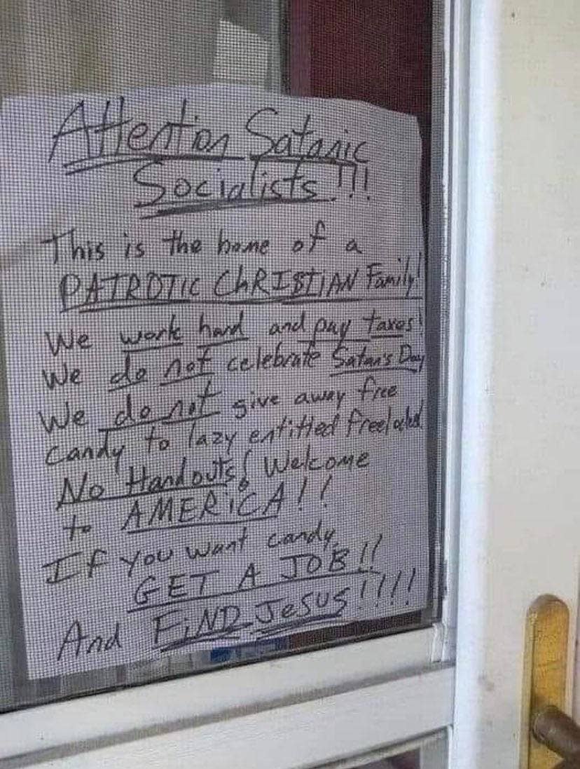 The Halloween sign called trick-or-treaters 'Satanic Socialists' and 'lazy, entitled freeloaders'.