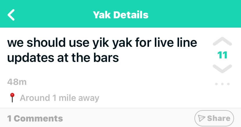 Like I said previously, Yik Yak is really like Twitter with Reddit functionality. You’re posting tweet-like content, with anonymity and a karma system like Reddit.
