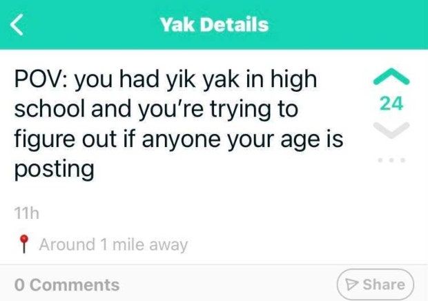 Yik Yak was hugely popular in my town when I was in high school, and my town was very good at making it a wholesome place to be, throwing compliments to people they didn’t know very well and just making jokes about school.