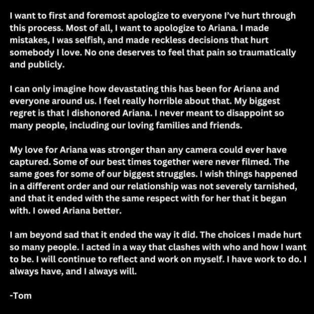 "I can only imagine how devastating this has been for Ariana and everyone around us. I feel really horrible about that. My biggest regret is that I dishonored Ariana. I never meant to disappoint so many people, including our loving families and friends," Sandoval's statement read, in part.