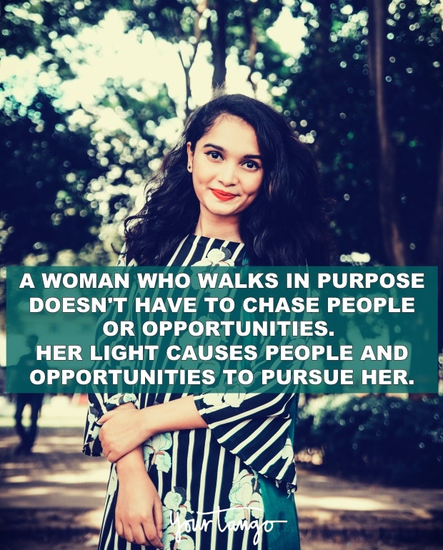 "A woman who walks in purpose doesn't have to chase people or opportunities. Her light causes people and opportunities to pursue her." — Unknown