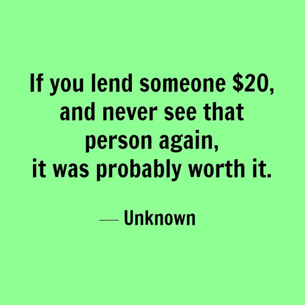 10. "If you lend someone $20, and never see that person again, it was probably worth it." — Unknown