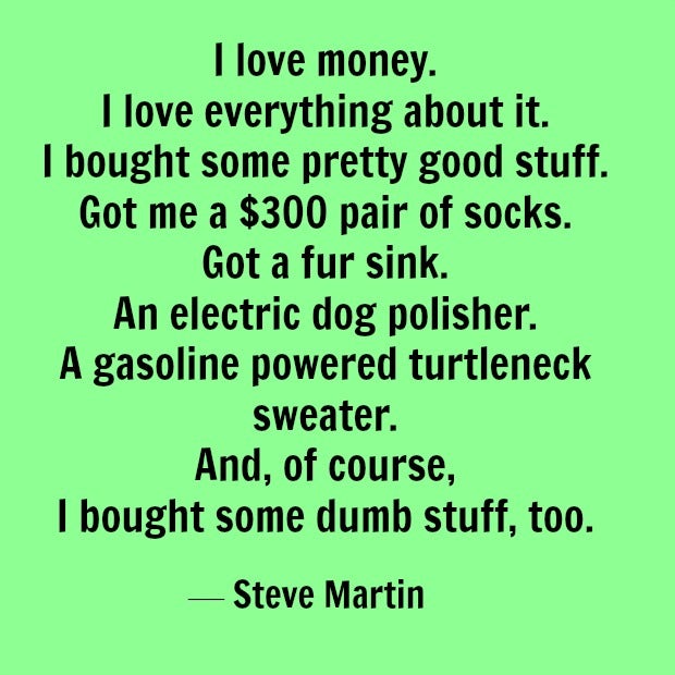 12. "I love money. I love everything about it. I bought some pretty good stuff. Got me a $300 pair of socks. Got a fur sink. An electric dog polisher. A gasoline powered turtleneck sweater. And, of course, I bought some dumb stuff, too." — Steve Martin