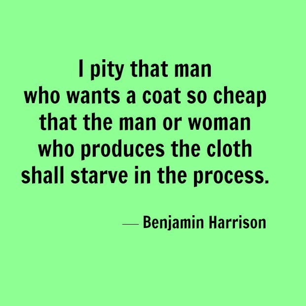 6. "I pity that man who wants a coat so cheap that the man or woman who produces the cloth shall starve in the process." — Benjamin Harrison