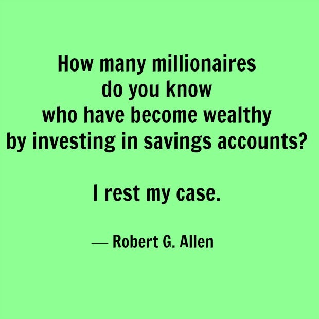 9. "How many millionaires do you know who have become wealthy by investing in savings accounts? I rest my case." — Robert G. Allen