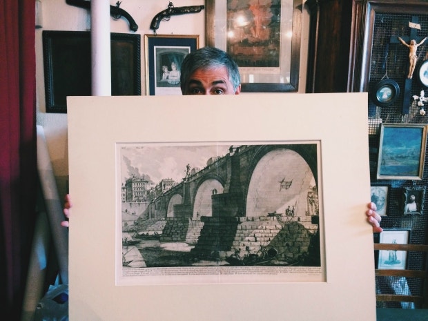 I own legitimate "Could be in a museum!" art. An art dealer named Francesco (who I did not make out with) is holding my first real art purchase. It's the first edition Piranesi and it's of the bridge across from Castel Sant'Angelo in Rome. You can actually see the building we are standing in the etching.