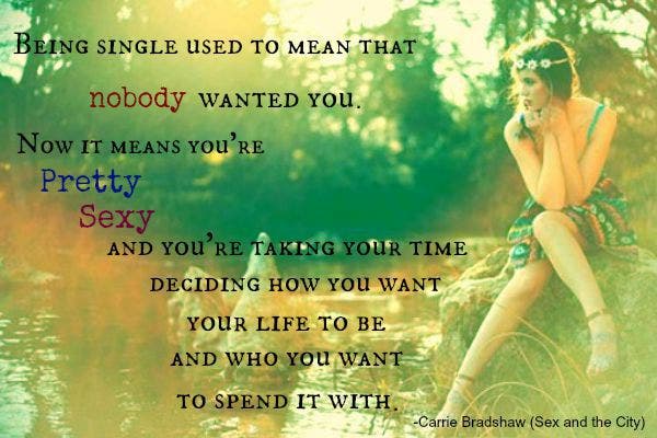 Being single used to mean that nobody wanted you. Now it means you're pretty, sexy and you're taking your time deciding how you want your life to be and who you want to spend it with. — Carrie Bradshaw