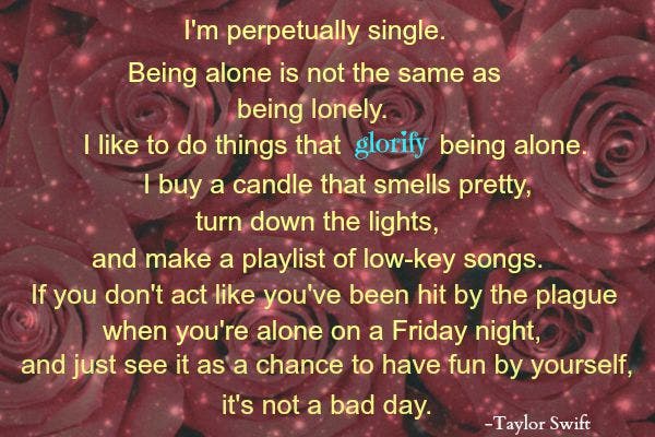 I'm perpetually single. Being alone is not the same as being lonely. I like to do things that glorify being alone. I buy a candle that smells pretty, turn down the lights, and make a playlist of low-key songs. If you don't act like you've been hit by the plague when you're alone on a Friday night, and just see it as a chance to have dun by yourself, it's not a bad day. — Taylor Swift