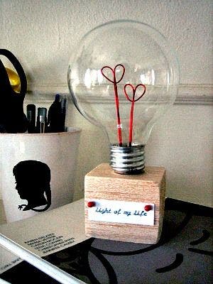 - Cut a ten inch piece of wire to make a heart "filament." Fold the wire in half to create a sharp crease, then unfold. About an inch from the crease, take both loose wire ends and loop both wires around to create the heart halves. Then pull both wires back down, overlapping the center of the crease and extending beyond the heart shape. You may want to tweak the heart halves a little to get heart shape that you like. Your heart should be about 1/2" wide so it will fit through the base of the bulb pretty easily.