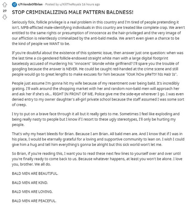 In what appears to be a cruel and unusual branch form of sarcasm, the posts have also claimed Laundrie is being victimized for his baldness.