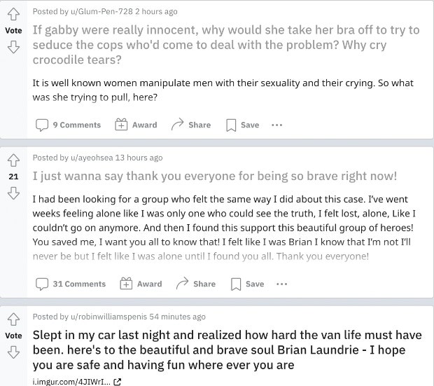 Echoing language used in incel forums, users on the subreddit also called those seeking justice for Petito “vengeful feminists” who are conspiring against Laundrie.