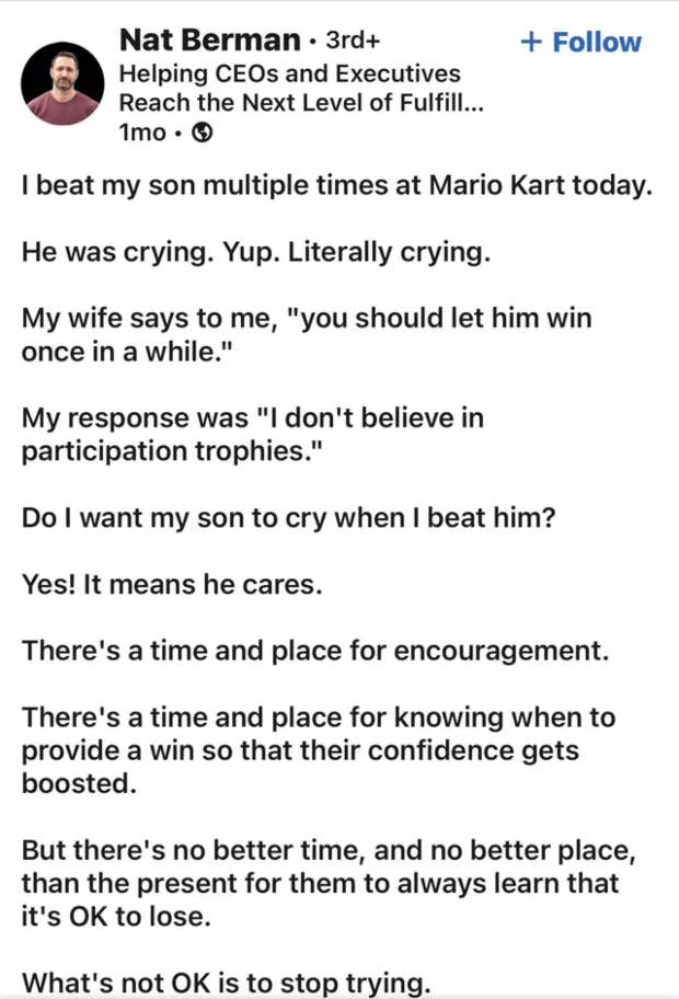 “He's really flexing beating his kid at f--king Mario kart” one user writes, mocking the fact that Berman is using this as a moral lesson to professional followers on LinkedIn.