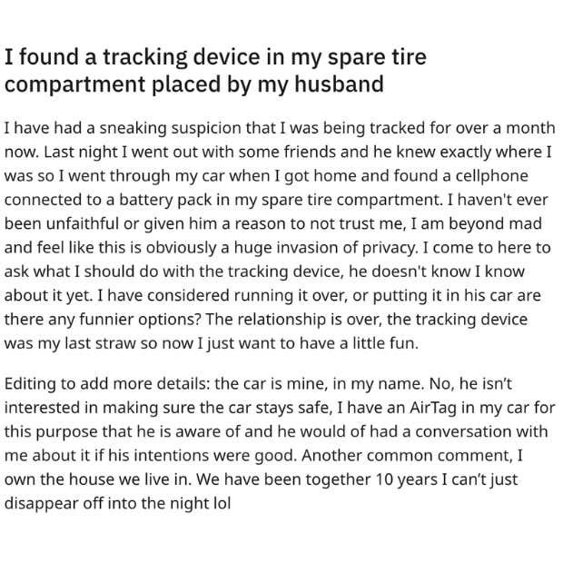 The violation is the last straw for her—and now she wants revenge. "What I should do with the tracking device," she asked her fellow Redditors. "I have considered running it over, or putting it in his car, [but[ are there any funnier options?," she went on to say. "The relationship is over…so now I just want to have a little fun.