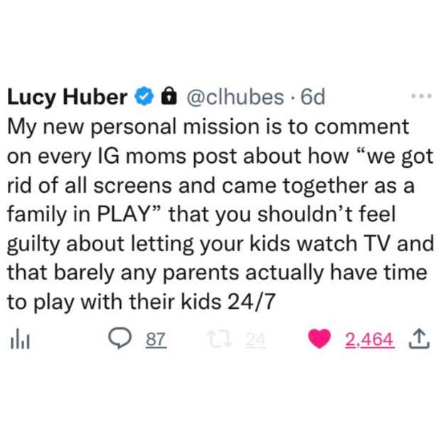 Her tweet came in response to one by fellow writer Lucy Hubel in which she hit back at moms who shame other moms online for letting their kids have too much screen time.