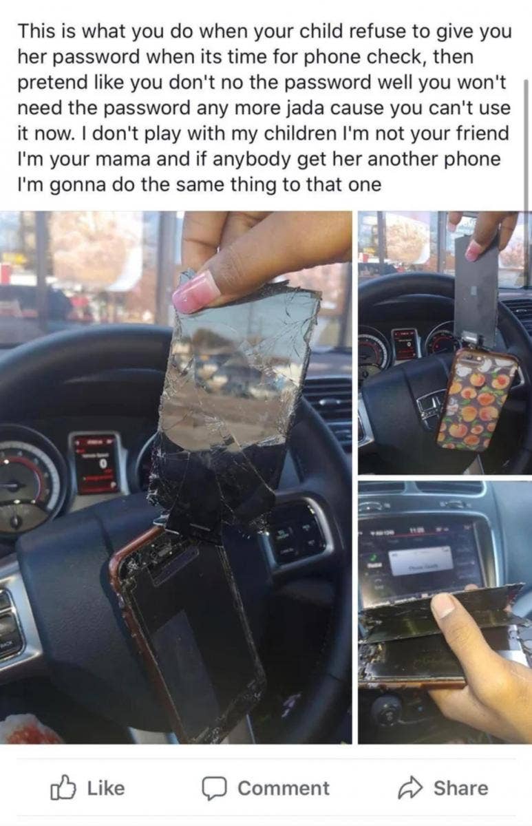 Attached to the post were three separate photos showing the destruction she caused to her daughter’s phone — the screen was completely shattered and coming off the device itself.
