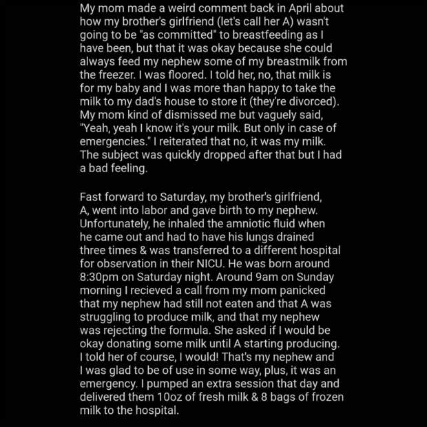 The new mom's brother started stealing her breastmilk and feeding it to his baby.