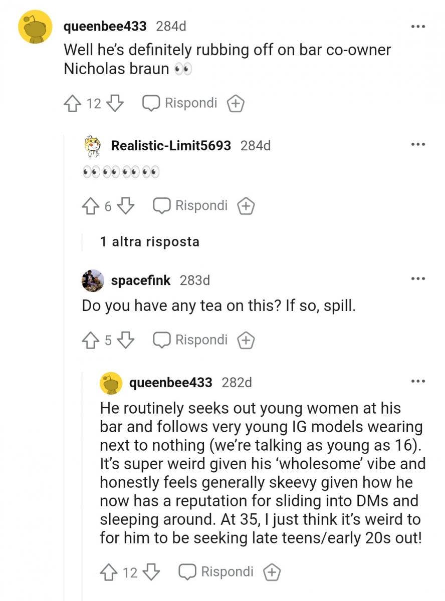 Another user also alleged that Braun uses his bar as sexual collateral, stating, “Apparently, he goes there regularly and is always seen leaving with women in their early 20s (he’s 34 now).”