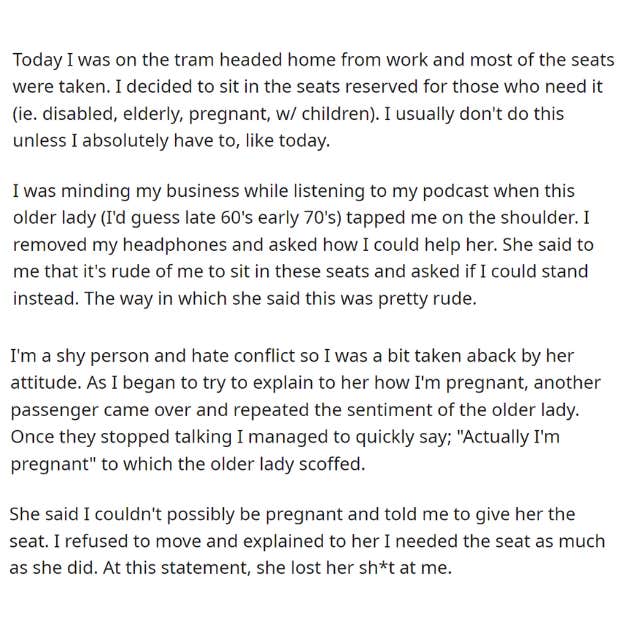 The woman who made the post was five and a half months pregnant and apparently didn’t “look very pregnant.” She described herself as a relatively "active" person who has been struggling with fatigue from pregnancy. “After a full day of work (I'm a uni lecturer) on my feet, I'm exhausted,” she explained.