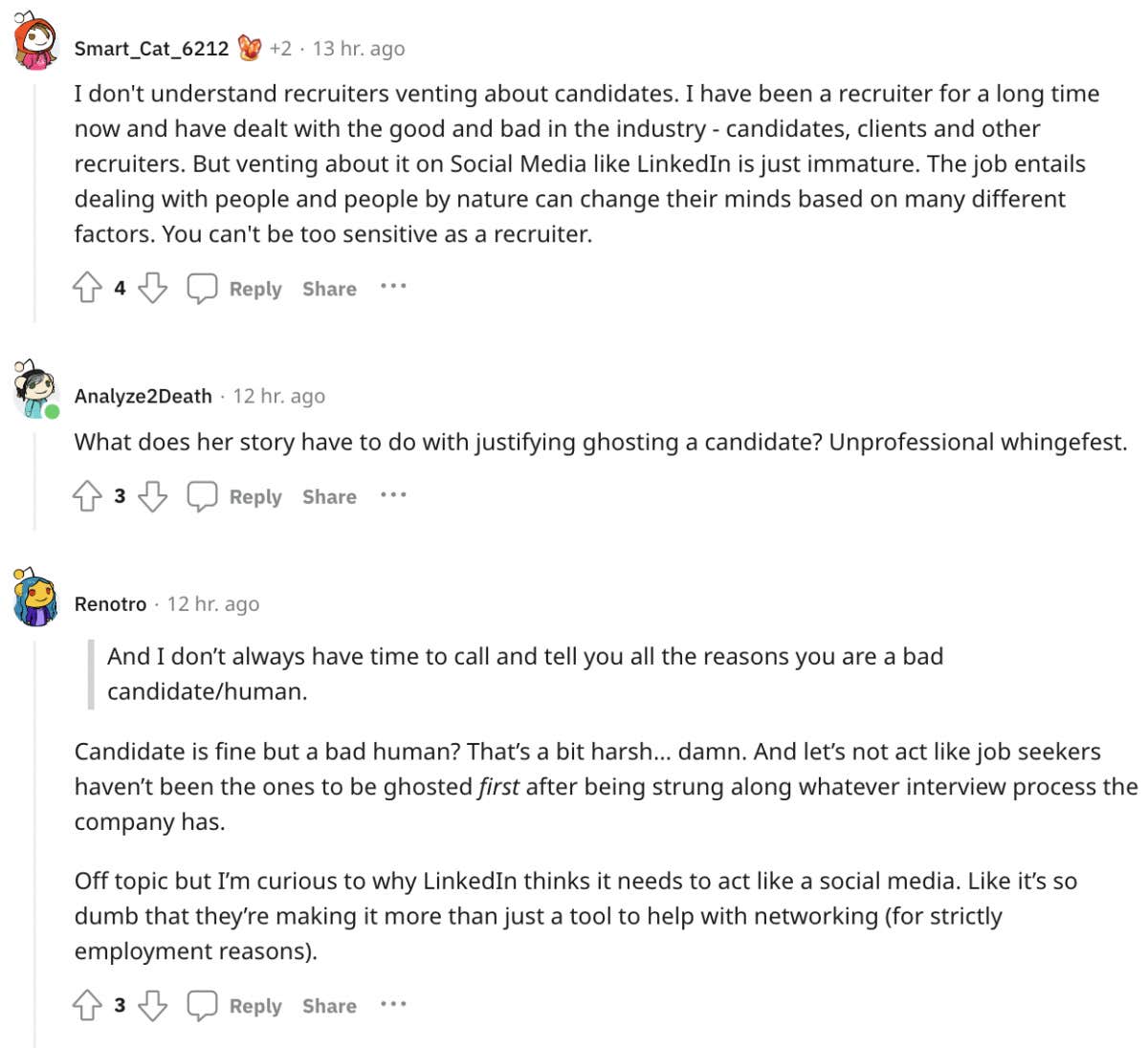 One person on LinkedIn said it was “a bit harsh and lacking empathy, understanding, or grace” to say that some candidates “deserve” to be ghosted. On Reddit, a job recruiter weighed in on the debate.