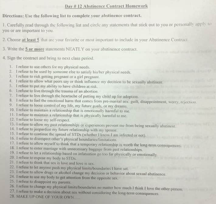 The second sheet that was sent home with these students was a contract. For homework, they were expected to sign a pledge not to have premarital sex. Again, this is at a public high school, not an evangelical Christian purity ball.