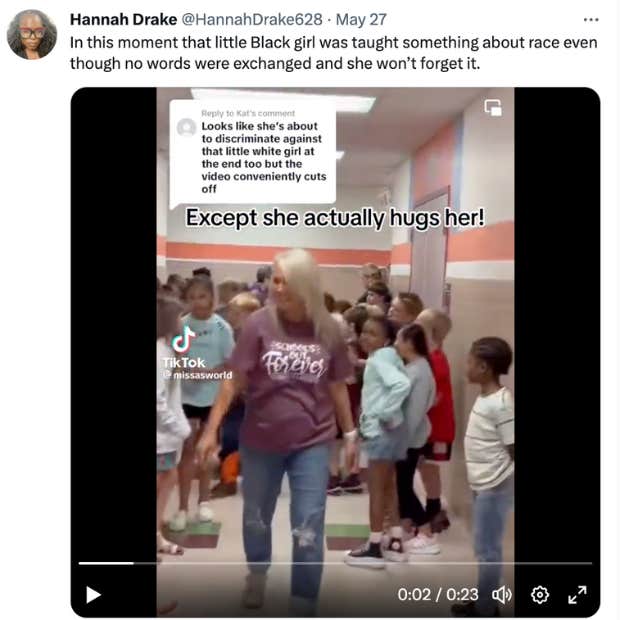 The video, posted by special education teacher and TikToker Miss A, known as @missasworld, was filmed on another teacher's final day of work before her retirement began. It shows her walking down the hallway of her school flanked by tons of excited children seeing her off. The teacher gives every child a warm goodbye hug, except for one young Black girl, who she gives a pat on the arm and a polite smile instead.