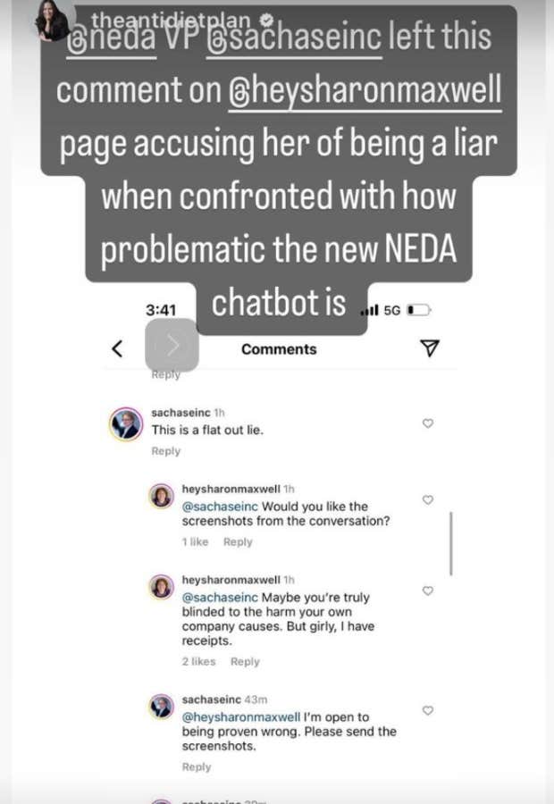 “It came to our attention last night that the current version of the Tessa Chatbot, running the Body Positive program, may have given information that was harmful and unrelated to the program," NEDA posted to their Instagram account. “We are investigating this immediately and have taken down that program until further notice for a complete investigation.” NEDA disabled comments on the post.