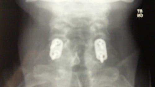 I spent 18 hours in the ER and many more in surgery. They completely removed two cervical vertebrae that had shattered into more than 150 pieces. Four disks were taken out. Every other disk in my spine was ruptured. Parts of my hips were removed and shaped into spacers, which were fused with the remaining vertebrae.