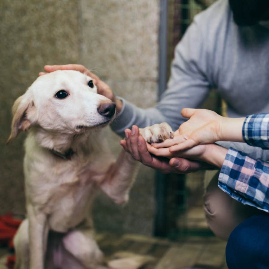 There's Ollie the pitbull, who once shied away from his owner's hand extending out to pet him while he was in a shelter cage. After being adopted, however, he confidently reaches out his paw to his new owner so that the two can hold hands!